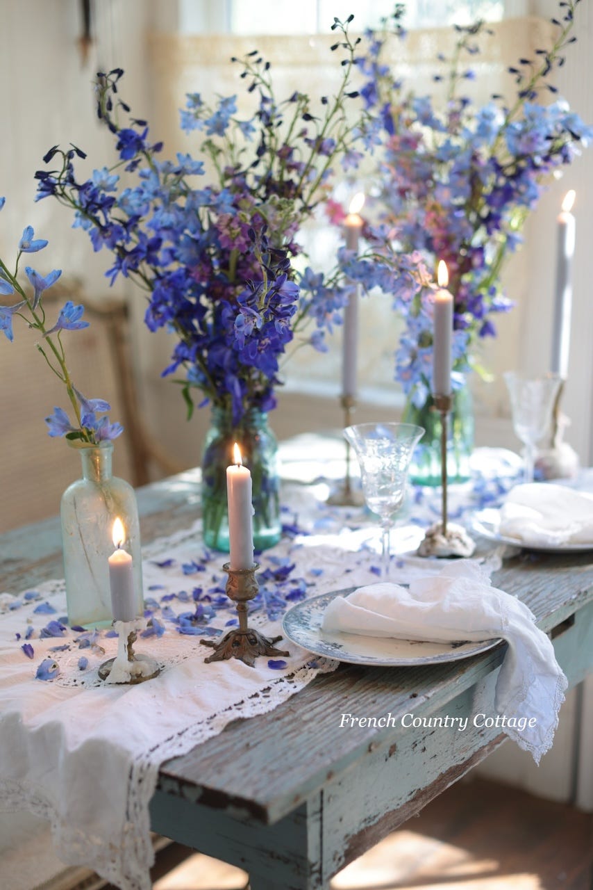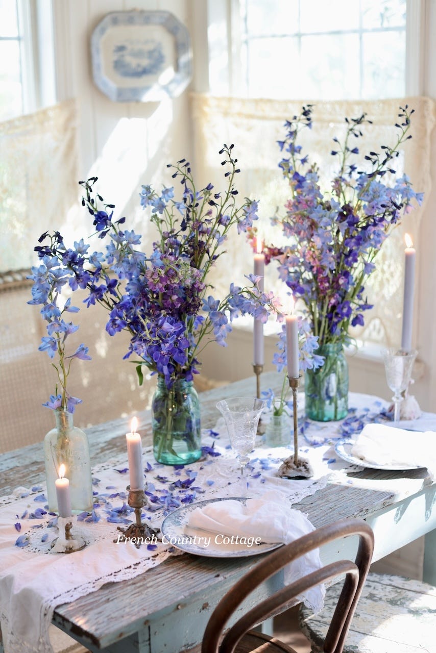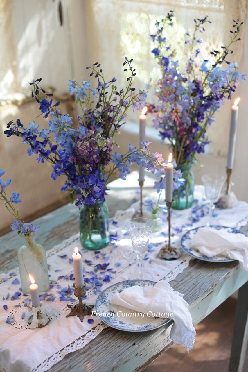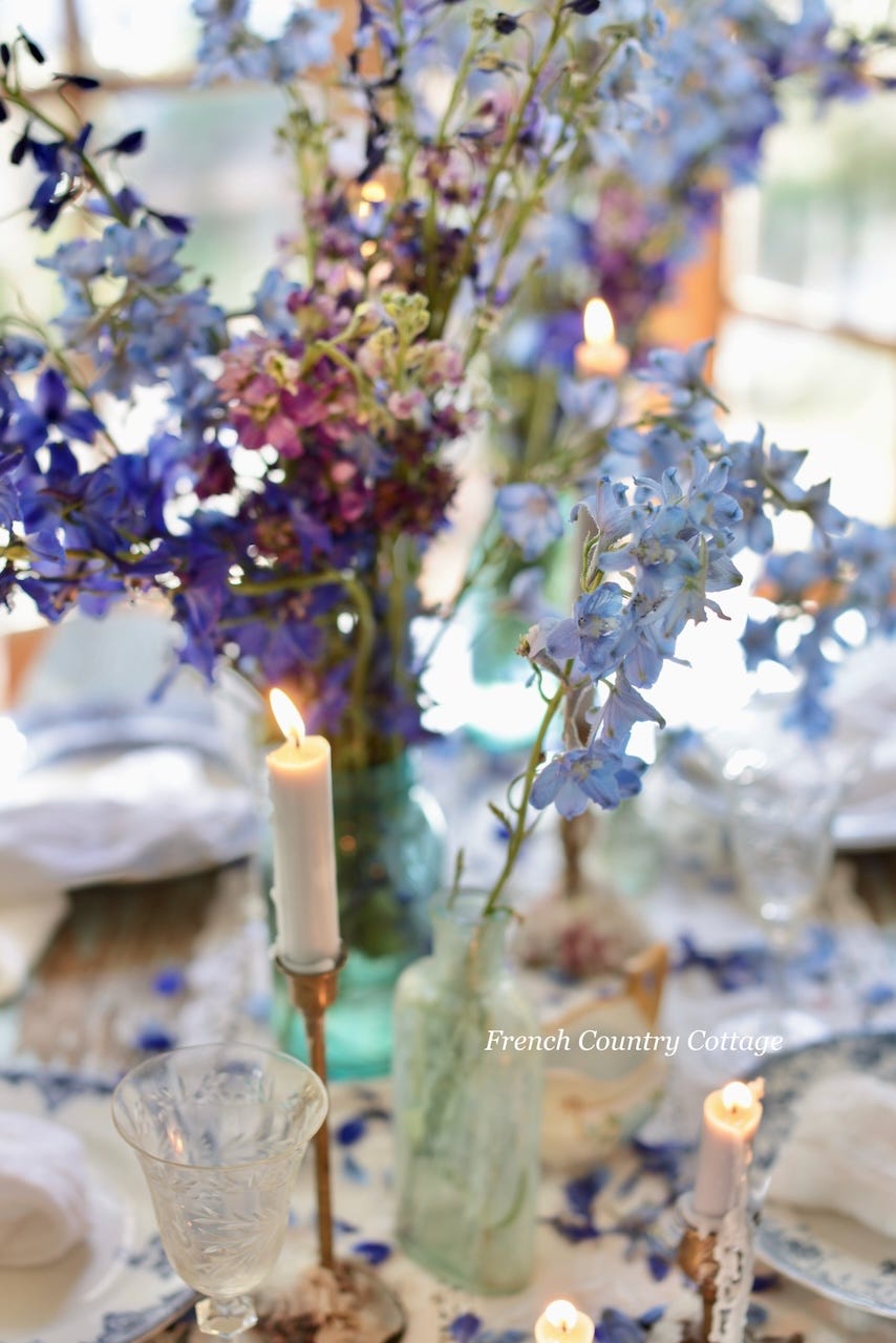 A little bit of Larkspur and a sprinkle of vintage blues on the table creates an enchanting styling for spring. We are jumping into this styling from my recent book ‘French Country Cottage In Bloom’ and sharing a bit more behind the look and how you can also achieve this look for your next gathering.