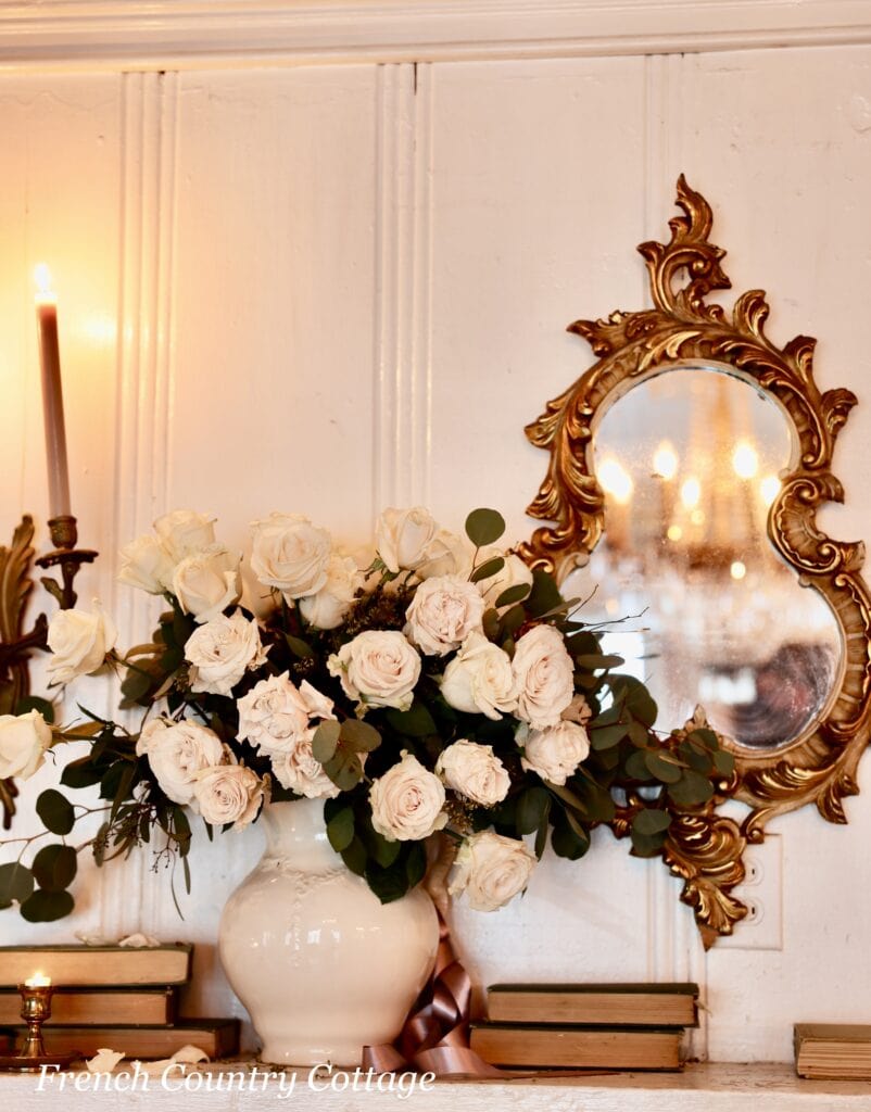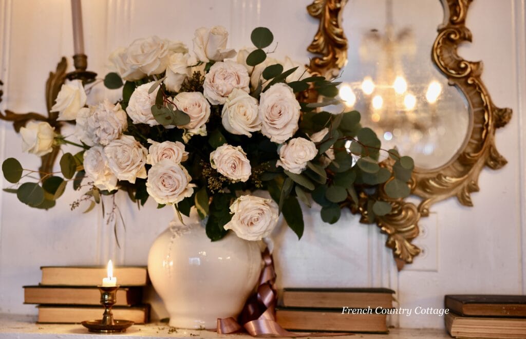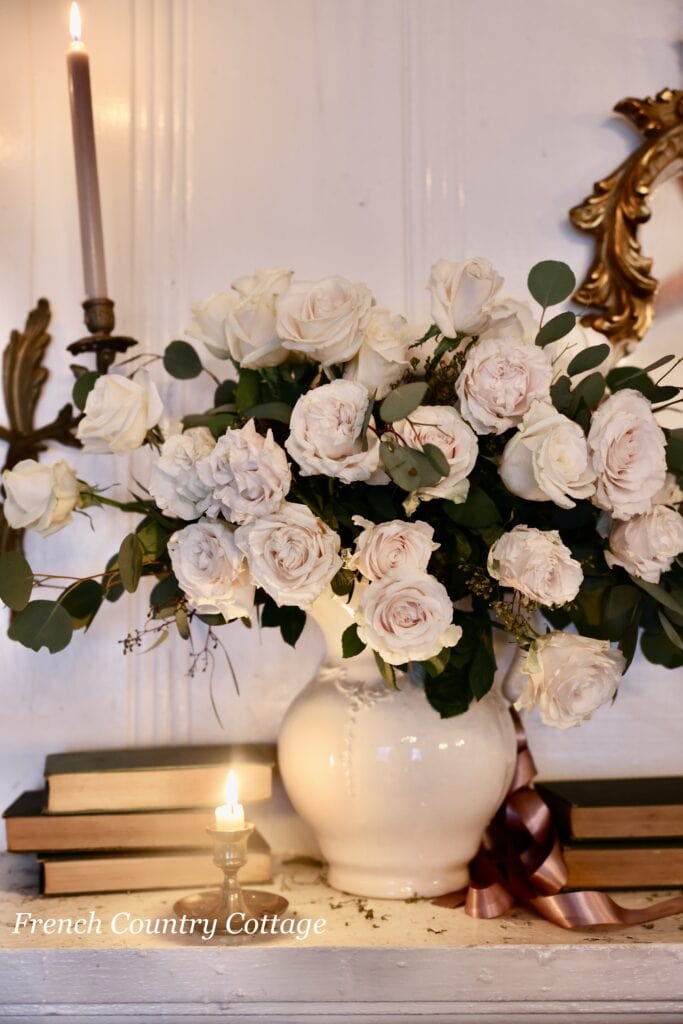 This one is even more simple because I am using just white roses in the arrangement. Sometimes a pop of color is perfection and full of spring cheer and other times- it is all about that more quiet look.