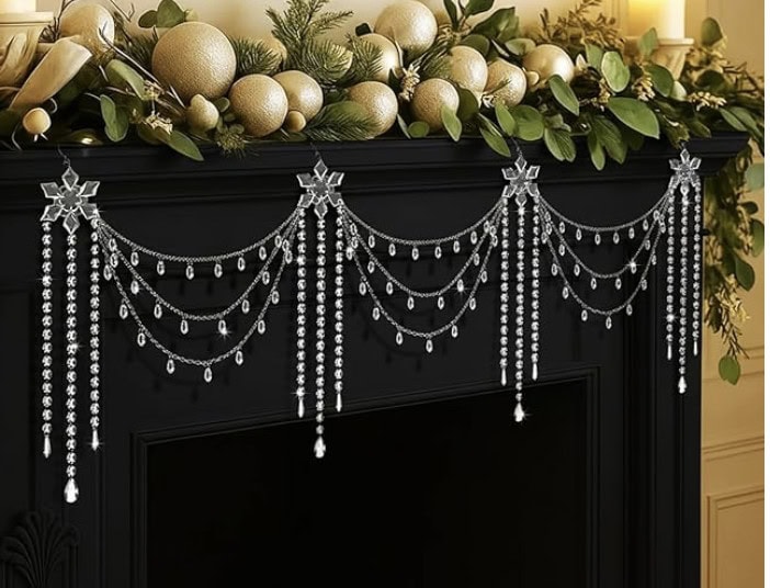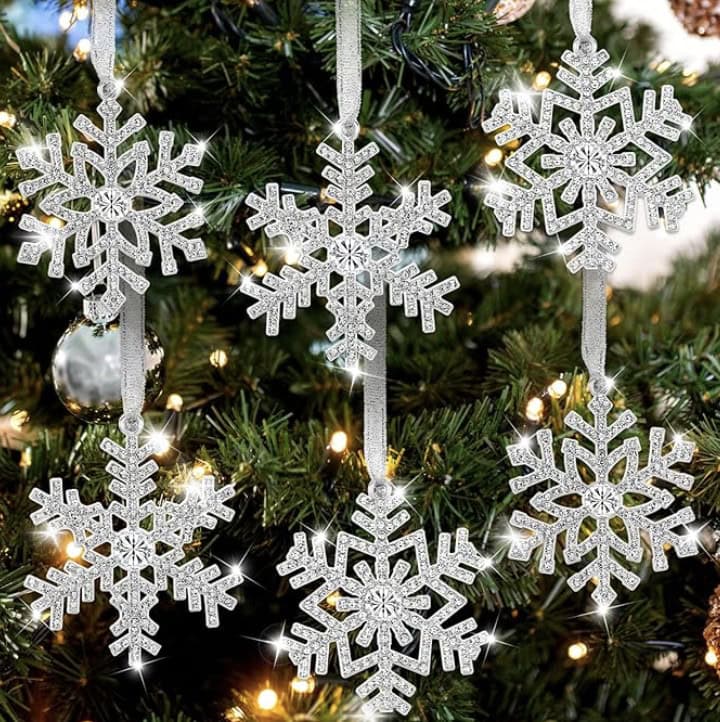 Then it is time for the detailed ornaments. Things like shaped ornaments, finials, drops and garlands. Add the drops and finials further out on the branches so they can dangle and fill in areas. Drape crystal or pearl or such garlands and add those detailed ornaments like snowflakes, etc. I also like to add bows and ribbons so you will often find those layered in as well.