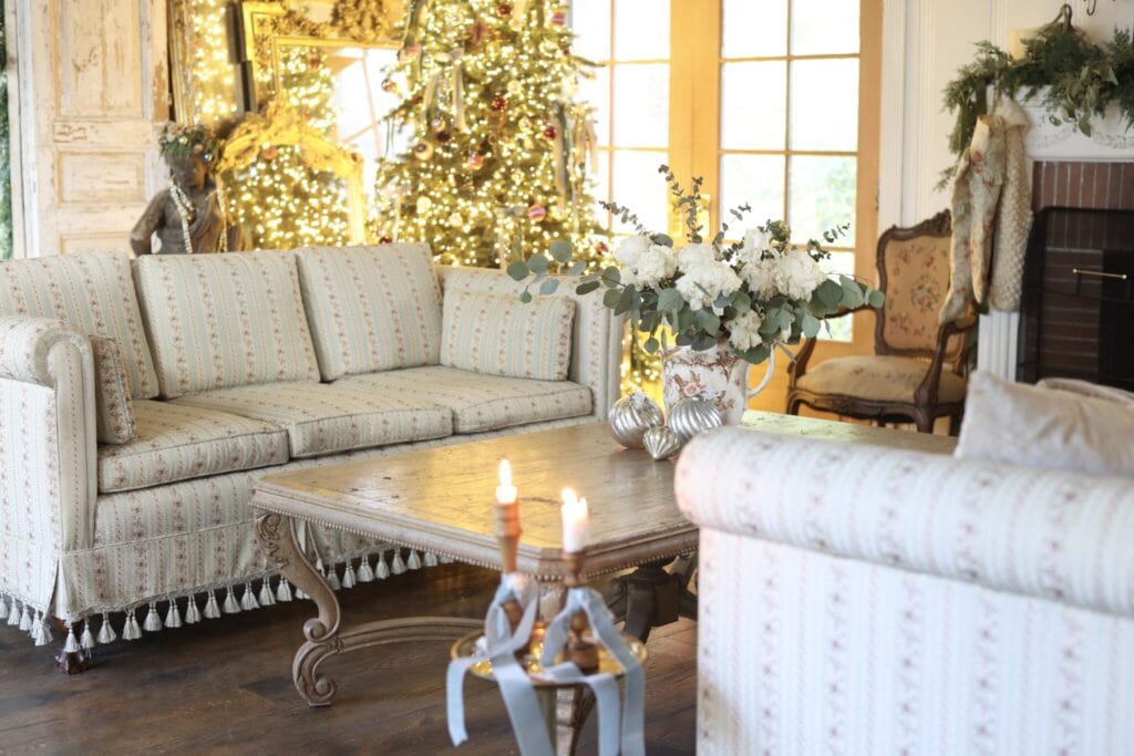 Step number 2– Bring in another sofa or one or 2 side chairs- whichever you prefer and works best for you and your room. I love both- I don’t think you can go wrong. See more of this vintage ticking sofa style HERE