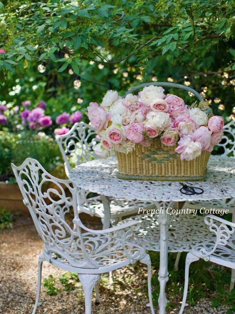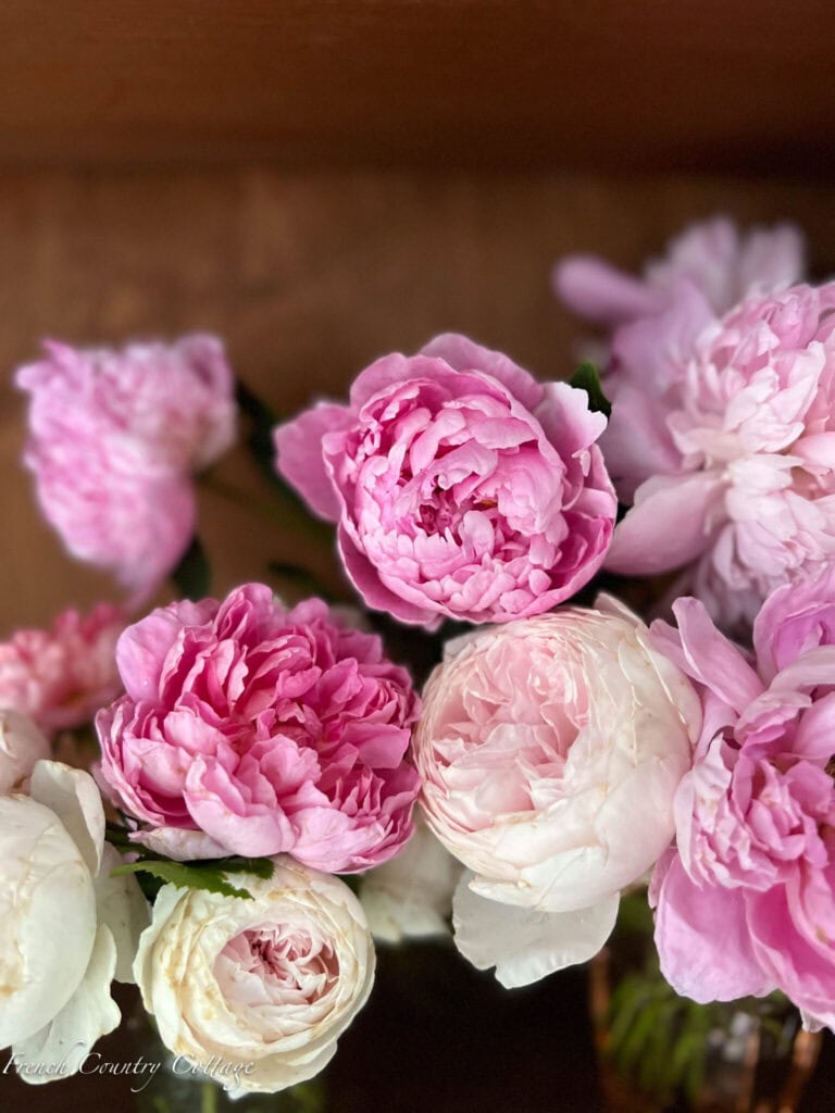 A basket full of beautiful blooms is always a good idea. One of the things I keep in mind when planting the garden and adding new flowers each year is to include the flowers that I love to bring inside on repeat. You can probably guess what some of those are. Those big and beautiful ruffle filled peonies and garden roses of course.