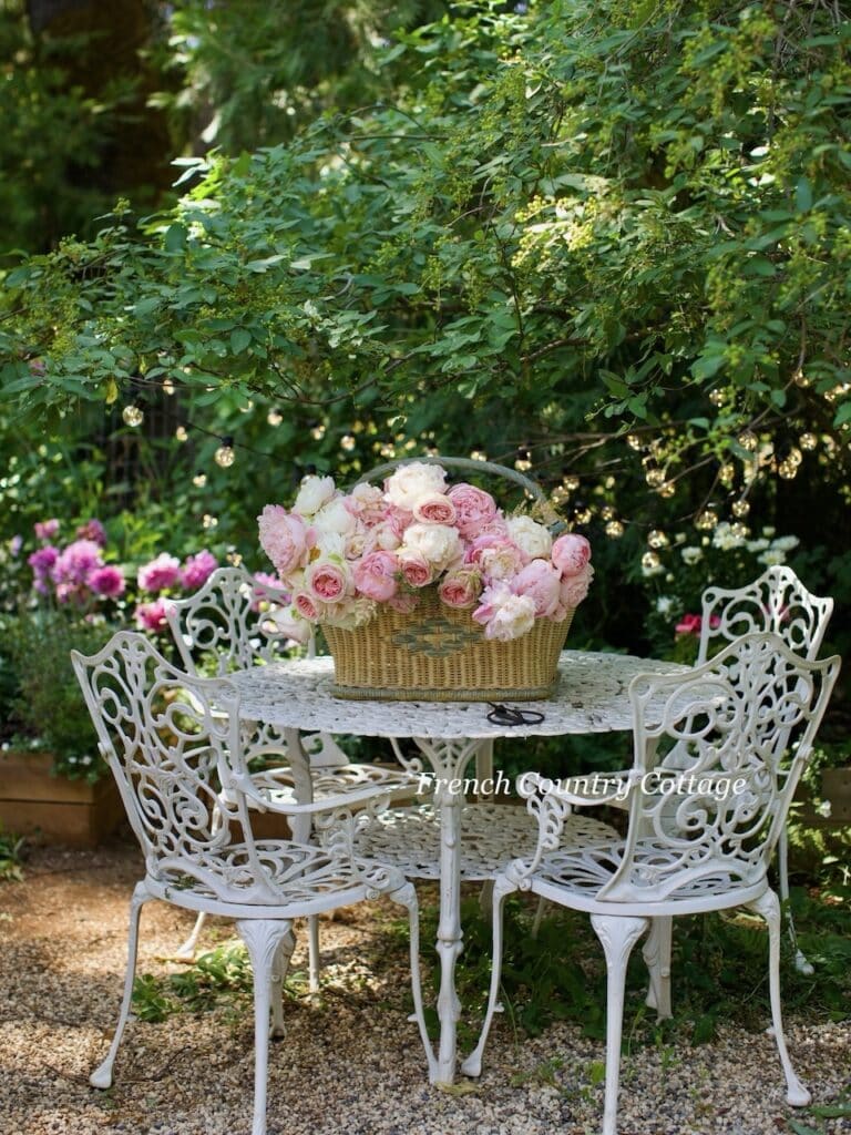 This flower filled basket of blooms was such a treat. Full of those delicious peonies and garden roses – it made such a lovely moment on the table in the garden. You can find this setting in my book IN BLOOM