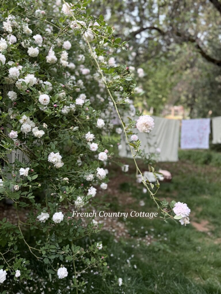 Cecile Brunner – we have several of these and they are such a treat. They ramble and vine and grow over all the things and create the most beautiful barely blush roses that fade to white.
